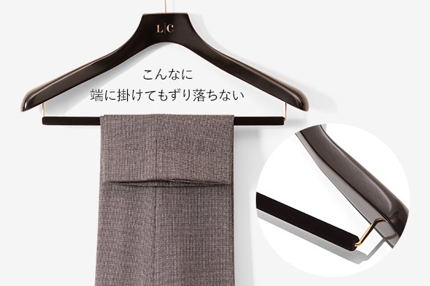 素材には木目が密で美しく手触りも滑らかで衝撃にも強いブナ材を使用し、ツヤのあるブラックの塗装で仕上げています。吸湿性を謳った無塗装のハンガーもありますが、ハンガーに掛けることで空間ができ空気が対流するため、ことさらハンガーに吸湿性を求める必要はありません。むしろ無塗装のハンガーはホコリを吸着するため、使用し続けると汚れが目立つ欠点があります。その点、塗装したハンガーならいつまでも美しく使えるのです。