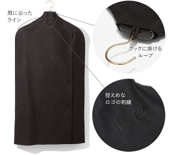 綿麻キャンバス生地の天然繊維であれば吸湿性に優れ、湿気の発散も速いので、ホコリだけでなく湿気からも洋服を守ります。また、しっかりした生地ですがソフト加工が施されているので手触りは柔らかで、洋服に馴染むので収納してもかさばりません。また程よい艶感で高級感もあります。まさに“洋服のための洋服”といえる機能性を備えた逸品です。