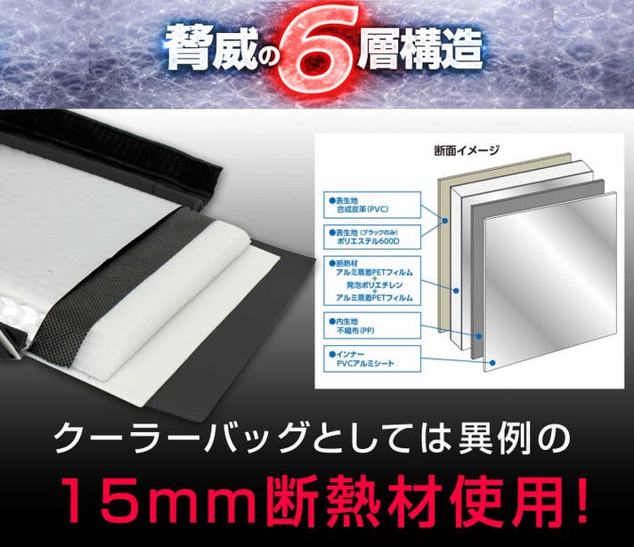 - 冷たさを逃がさない超保冷クーラーバッグ!天井、底、壁、6方向全てに通常の3倍の保冷断熱材使用