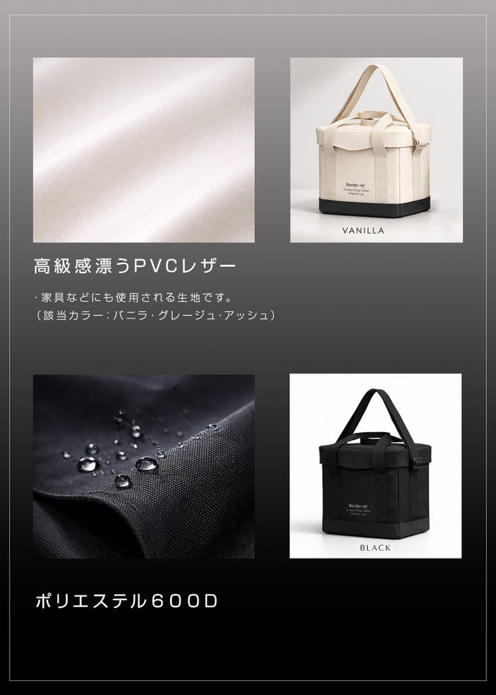 *)色は ブラック(ポリエステル600D仕様)、グレージュ(PVCレザー仕様)の2色から選べます。
