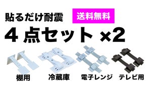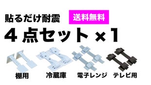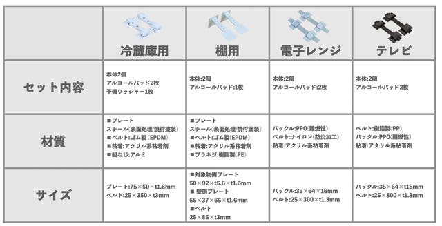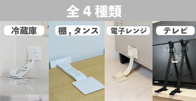 固定しておきたい重たい棚、冷蔵庫だけでなく、破損の恐れがある高価なTVなどの家財も守りたいというご希望もあり、必要となる4アイテムを展開しました。