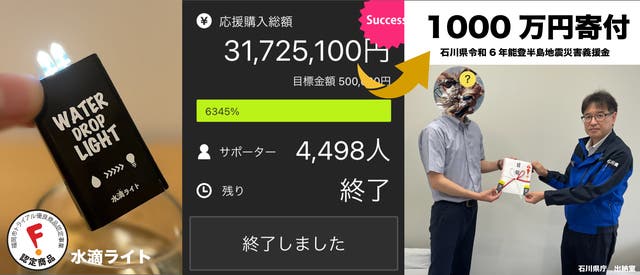 前回の水滴ライトは皆様の応援のおかげで3000万円以上販売することができ、そのうち1000万円を石川県へ寄付することができました!