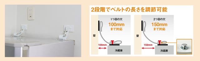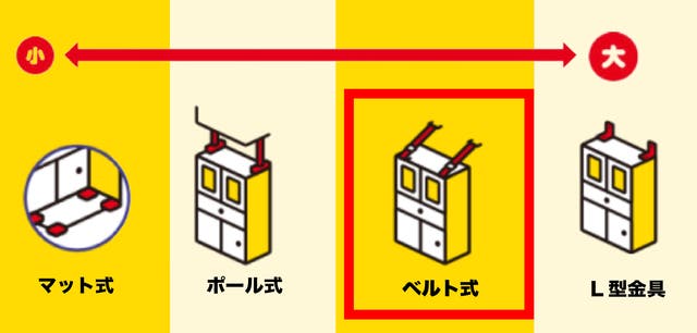 転倒防止には効果の大小があり、今回はL型の次に強いベルト式タイプに。