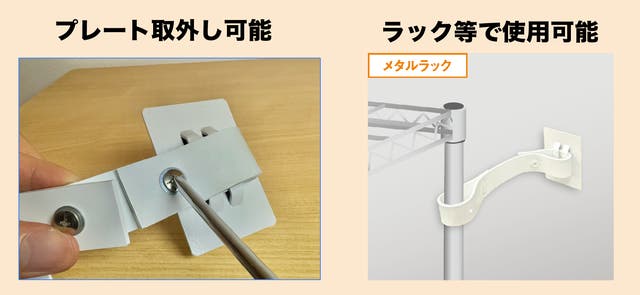 プレート部分を取外してメタルラックなど貼ることができない箇所に巻きつけての使用が可能です。