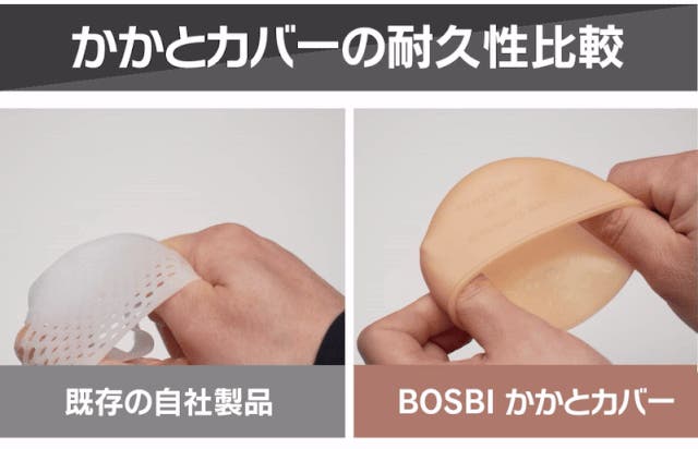 既存の自社製品に比べて伸縮性と復元力に優れ、強く引っ張っても破れにくいです。厚みも57%以上分厚くし、歩行時のかかとへの衝撃を吸収します。