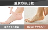 BOSBIのかかとカバーは、以前の自社のかかとパッドのようにストラップを足にかけて引っ張る必要がありません。足首を締めるストラップがないので、足首が腫れたり大きい方でも締めつける感じがなく快適にお使いいただけます。