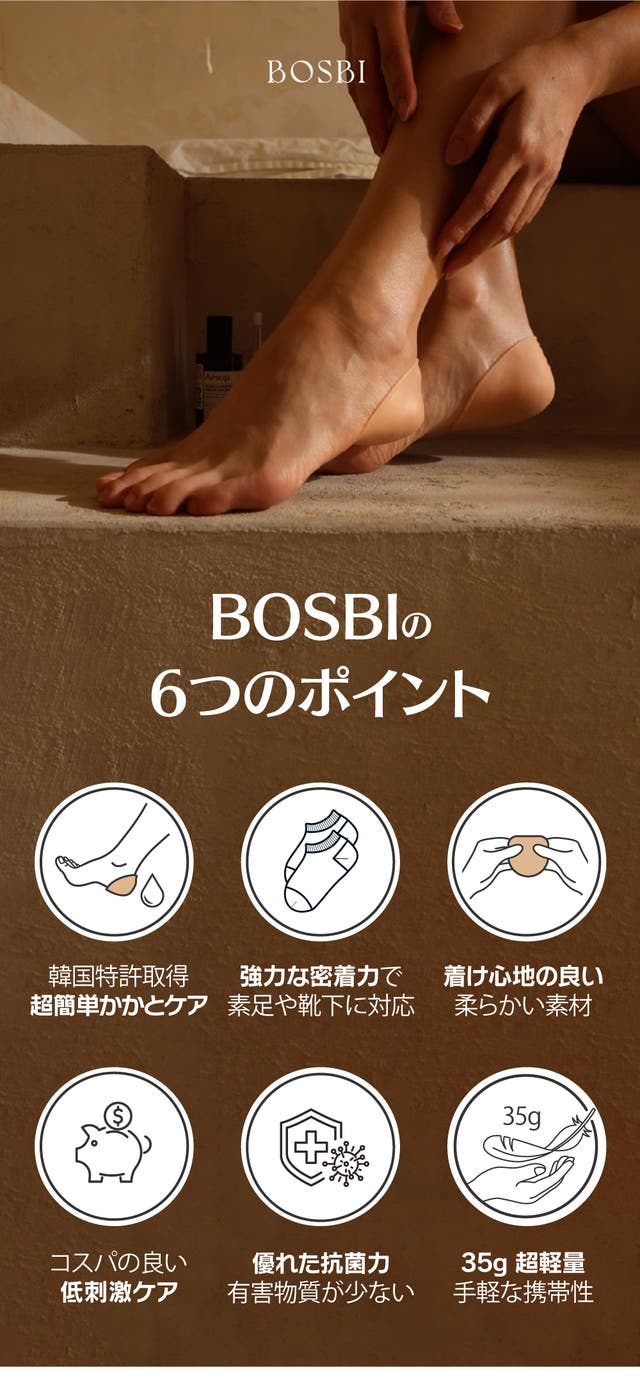 BOSBIのかかとカバーは、柔らかくてもちもちしたシリコンジェルに着目して開発するようになりました。 BOSBIのかかとカバーは、つけるだけでかかとケアができる製品として、韓国特許取得しました。