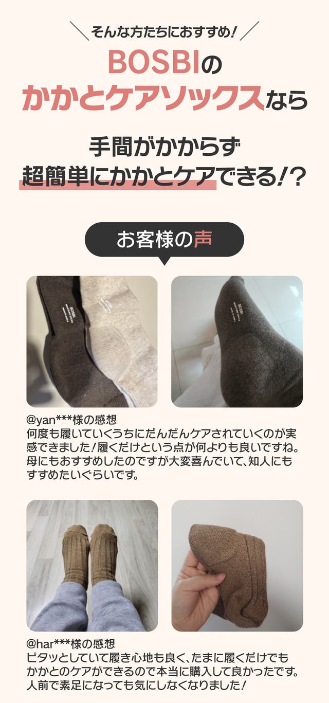 この商品を輸入しようと思った理由:かかとのケアに悩んでいる母にBOSBIのかかとケアソックスをプレゼントしました。大変満足したようなので、私も使ってみると特にケアする必要もなく、取り付けも簡単でした!MAKUAKEの皆様にもご紹介したいと思いプロジェクトを進行することになりました。