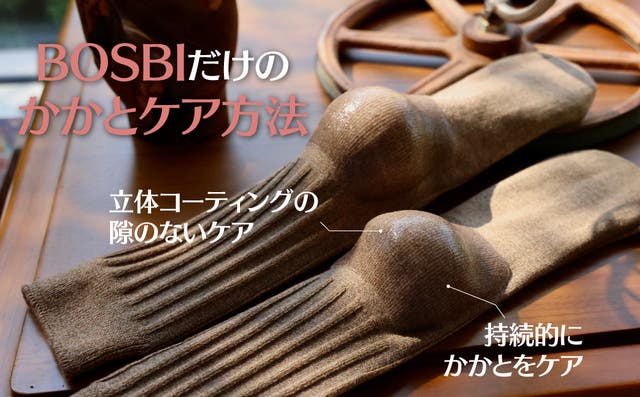 BOSBIのかかとケアソックスは、密着力を高めるために立体コーティングが施されています。かかとからアキレス腱につながる人体曲線にコーティング面が密着するよう、連結部のシリコンコーティングを薄く処理しているので、より快適な着用感を感じることができます。