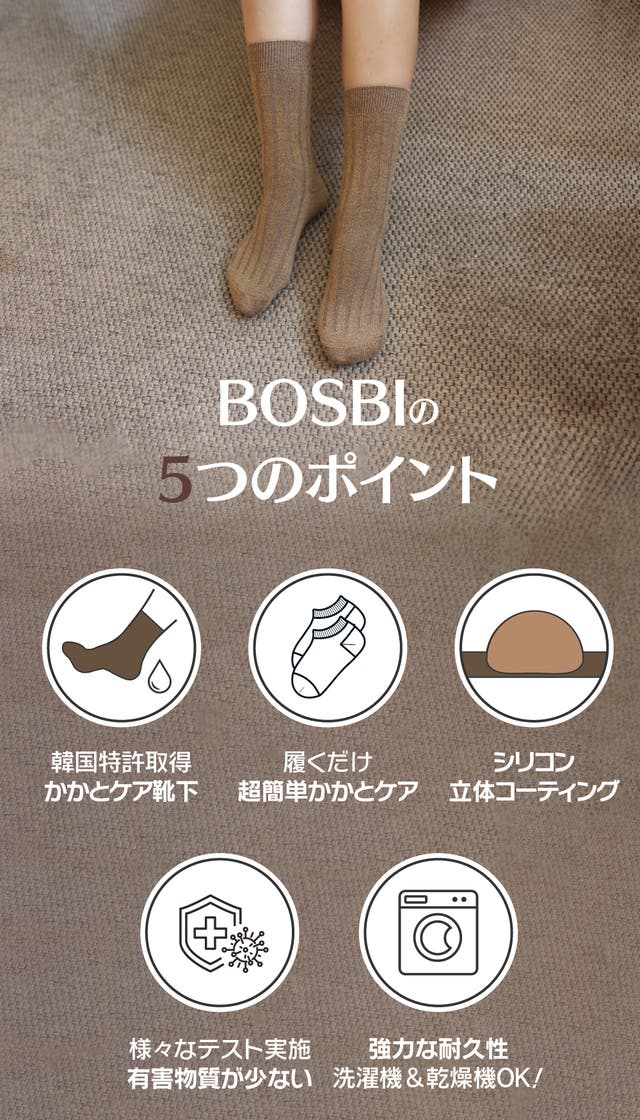 BOSBIのかかとケアソックスは、皆さんのかかとの悩みに着目して開発するようになりました。 BOSBIのかかとケアソックスは、履くだけで持続的にかかとケアができる製品として韓国特許取得しました。
