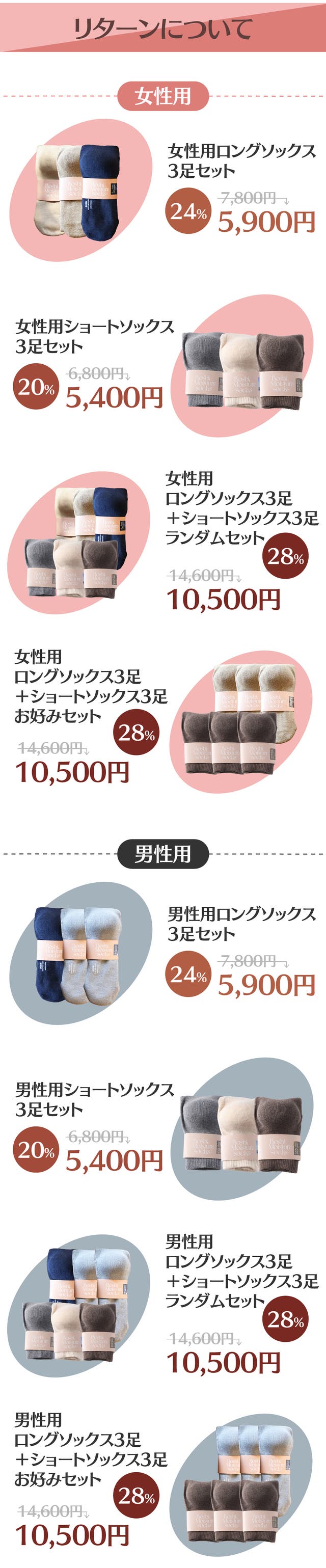 ※カラーはロングソックス各2色、ショートソックス各3色の中から1色ずつお選びいただけます。