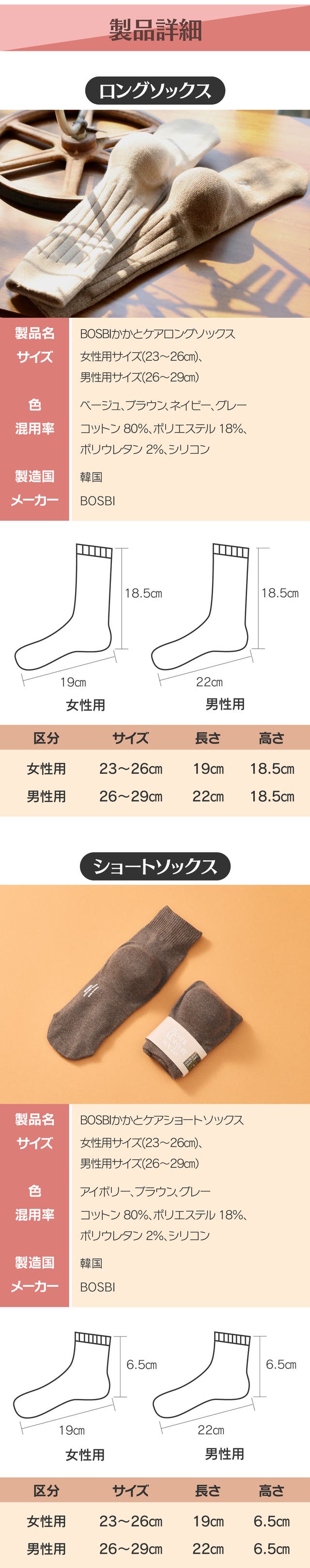 こんにちは。BOSBIはお客様のお声をもとに新しい製品を作り上げていこうと精神を尽くしています。今回皆様にご紹介するかかとケアソックスは、皆様のお声をもとに製作致しました。靴下の色や質感は糸から違いがでると思い、一つの色を表現するとしても奥ゆかしい色味を表現できるように糸から直接製作するようになりました。連射工程を通じて2色の糸を自然に混合して靴下を作りました。このようにして作られた、かかとケアソックスが皆様の日常の小さな安らぎになることを願っています。