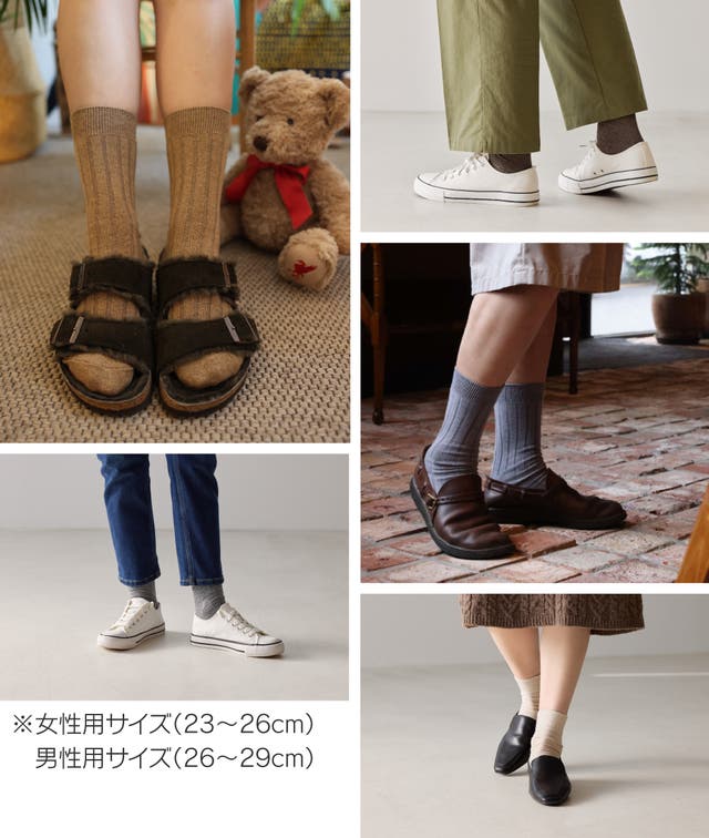 A:ロングソックスの女性用サイズのカラーはベージュ、ブラウン、ネイビーの3色、男性用サイズのカラーはグレー、ネイビーの2色です。ショートソックスは男女両サイズともに、アイボリー、ブラウン、グレーの3色です。
