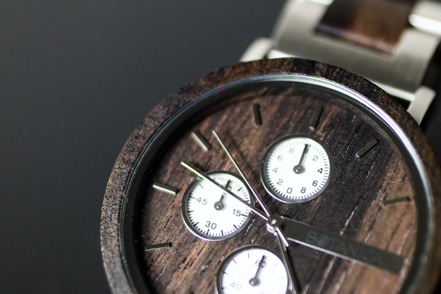 それはダイヤルがフラットに作られていたり、クロノグラフの金属部分が全体的な木の柔らかさを引き締めているからに違いありません。