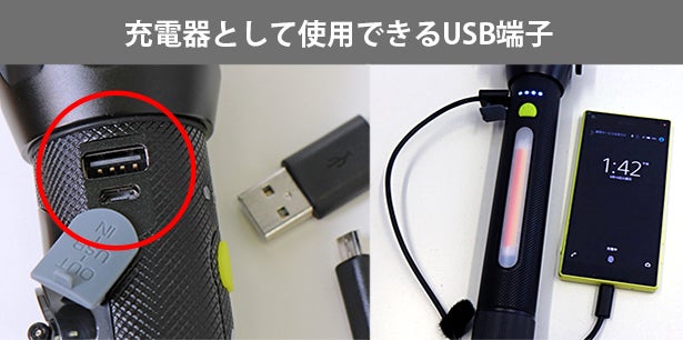 ・電気のない場所でも安心。懐中電灯本体にモバイルバッテリー機能付き
