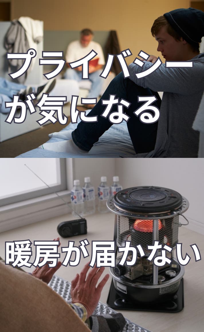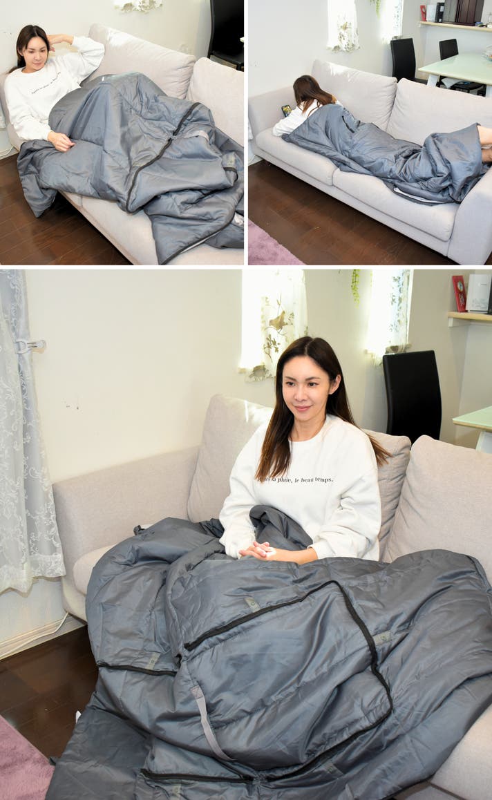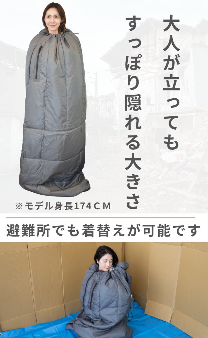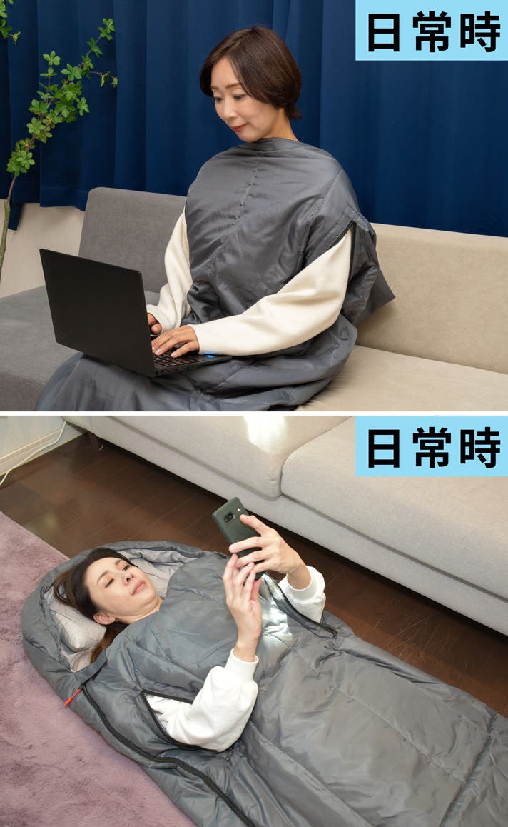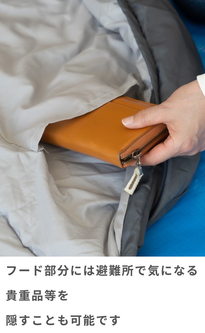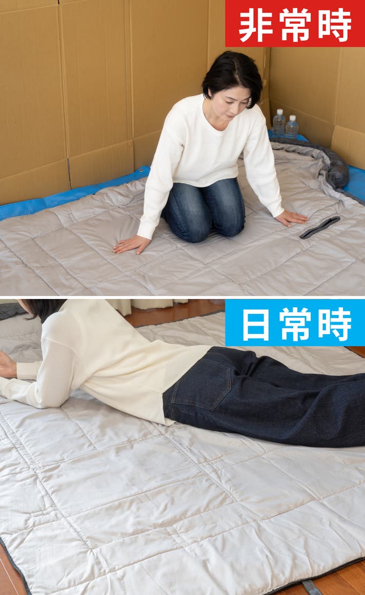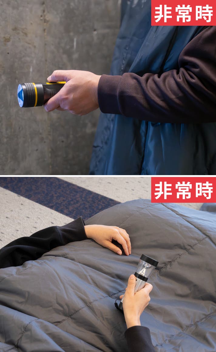 自由に両腕が使えるので通常時は着る布団とし、非常時にもライトを持ったりと便利な機能です。