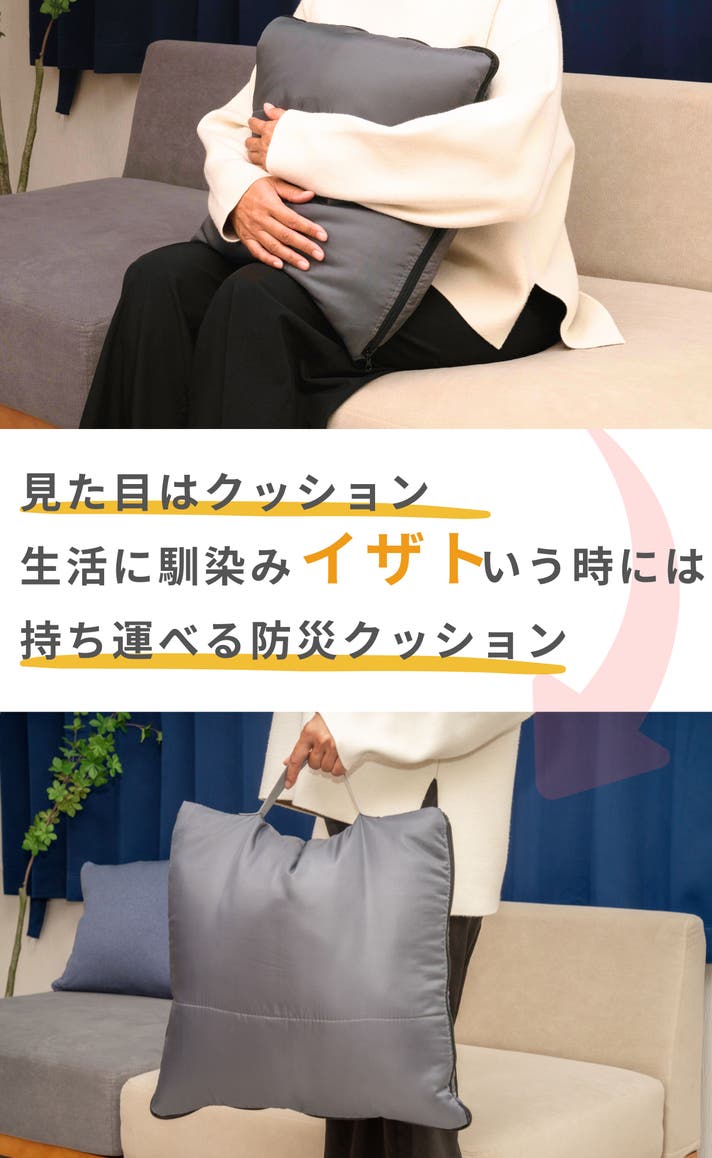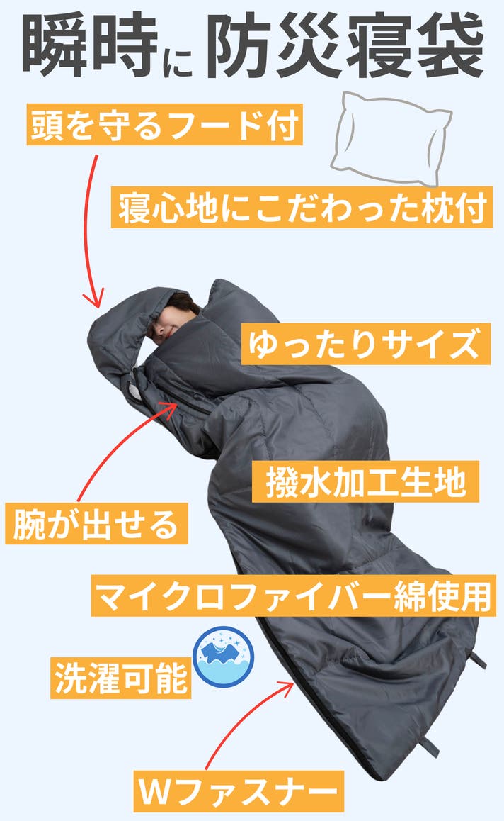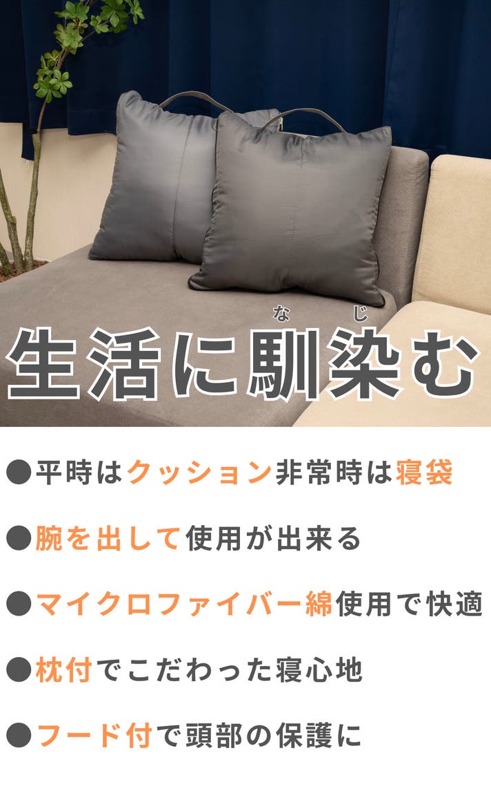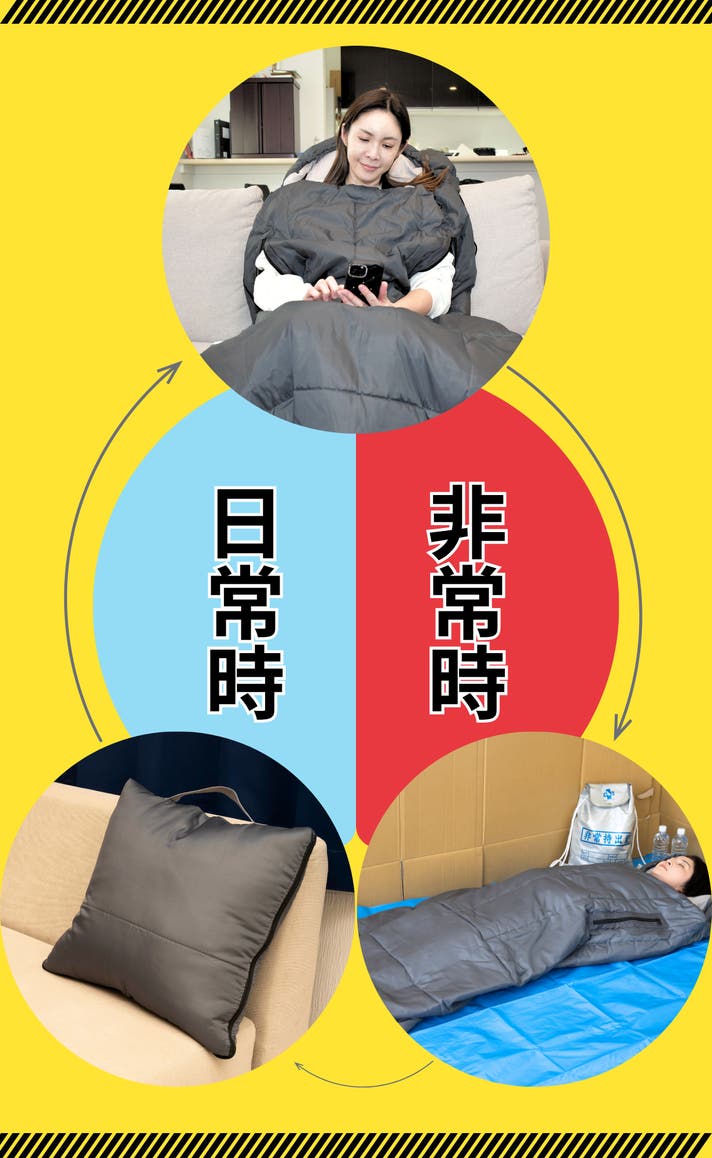 避難所等で睡眠環境とプライベートを確保するのに活躍するのが寝袋です。そんな寝袋を普段の生活に取り入れたのが「腕が出せるクッション型防災寝袋」です。