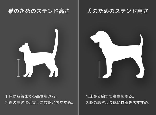 犬猫が食べやすい最適な高さや角度を考慮して制作しました。 ペットに合ったステンレスの長さを確認して選択してください。