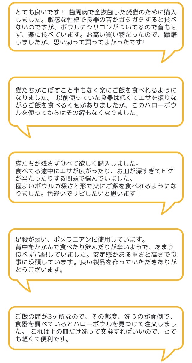 ペットに合う高さを選ぶことで、自然に立つ姿勢になるのでペットの食時間が楽で楽しくなります。ペットの快適な食事タイムのためにぜひハローボウルを使ってみたください。