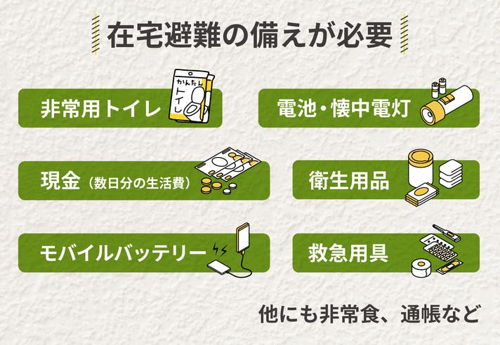 全国多くの自治体において、避難所へ入れる住民は 1 割から 2 割程度です。そしてトイレ・飲料水・食料などの備蓄品は、原則として避難所の定員分しかありませんので、大規模災害時には 8 割から 9 割の方が自宅で生活をすることになります。