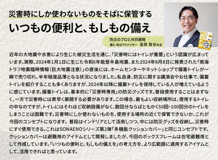 - 備え・防災アドバイザー高荷智也さん自らが欲しかった製品を共同開発!