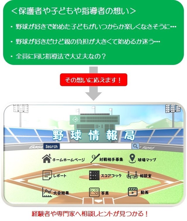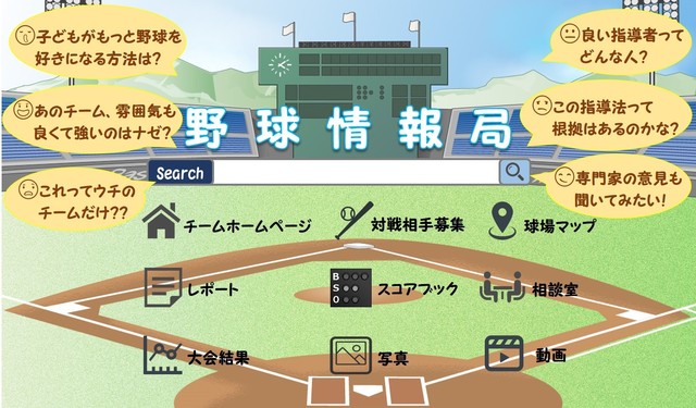 少年野球界の現状に保護者・指導者目線でメスを入れ、更なる発展に繋がる画期的なポータルサイト『野球情報局』を設立し、より良い少年野球界を目指し展開する活動の発信や、保護者や子ども達の役に立つ便利な機能を持たせた総合野球サイトを展開します。