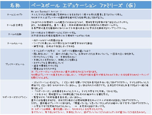 ◎ チームルール、プレーヤーズルール、サポーターズガイドラインは随時(年代や時代背景によって)ミーティングにより設立理念に準ずるものに変更します。