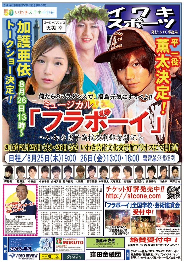 「笑って泣けて、やがて元気になるフラボーイ!!」皆様のご支援を頂戴し、ビッグミュージカルに成長させて頂けます事、キャスト一同心より願っております。是非とも熱いご声援お待ちしております!