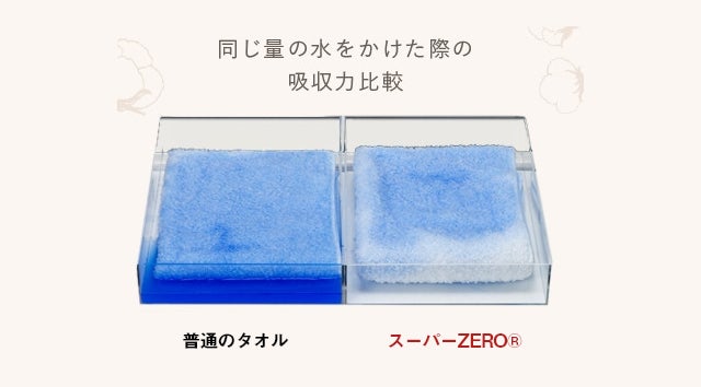 浅野撚糸様が特許を取得した撚糸技術「スーパーZERO®」により、糸が空気をたっぷり含んでいます。 この空気のスキマが、水分をぐんぐん吸収する秘密。 その吸水力は、一般的なタオルの1.5倍! 無撚糸タオルの4倍にもなります。