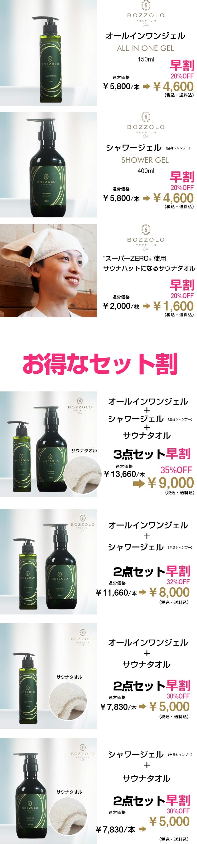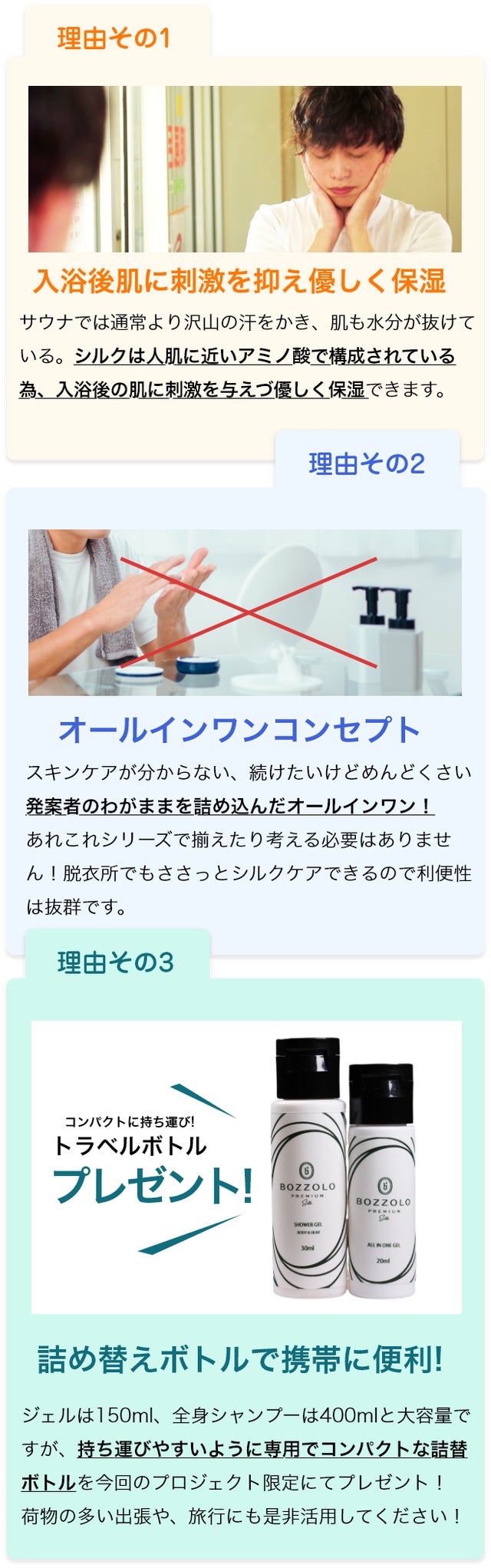 BOZZOLOオールインワンジェル、全身シャンプーは、サウナで失う水分からお肌を守り、みどり繭のシルク成分が保湿しエイジングケア※(※年齢に応じたケア)をサポートします。全ての男性、そしてサウナを愛する多くの方にBOZZOLOとともに、もっともっとサウナを楽しんでください!