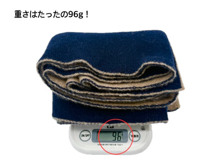 しかし今回私たちは、この編地を共同開発した日本のニット工場技術者と何度も綿密な打ち合わせを重ね、最終的に96g(当社比約50%の重量)という超軽量マフラーを完成させました。