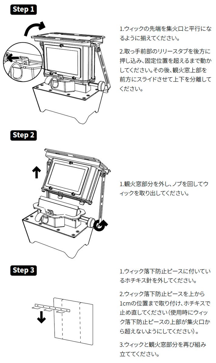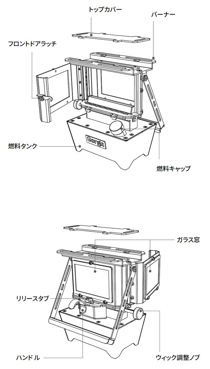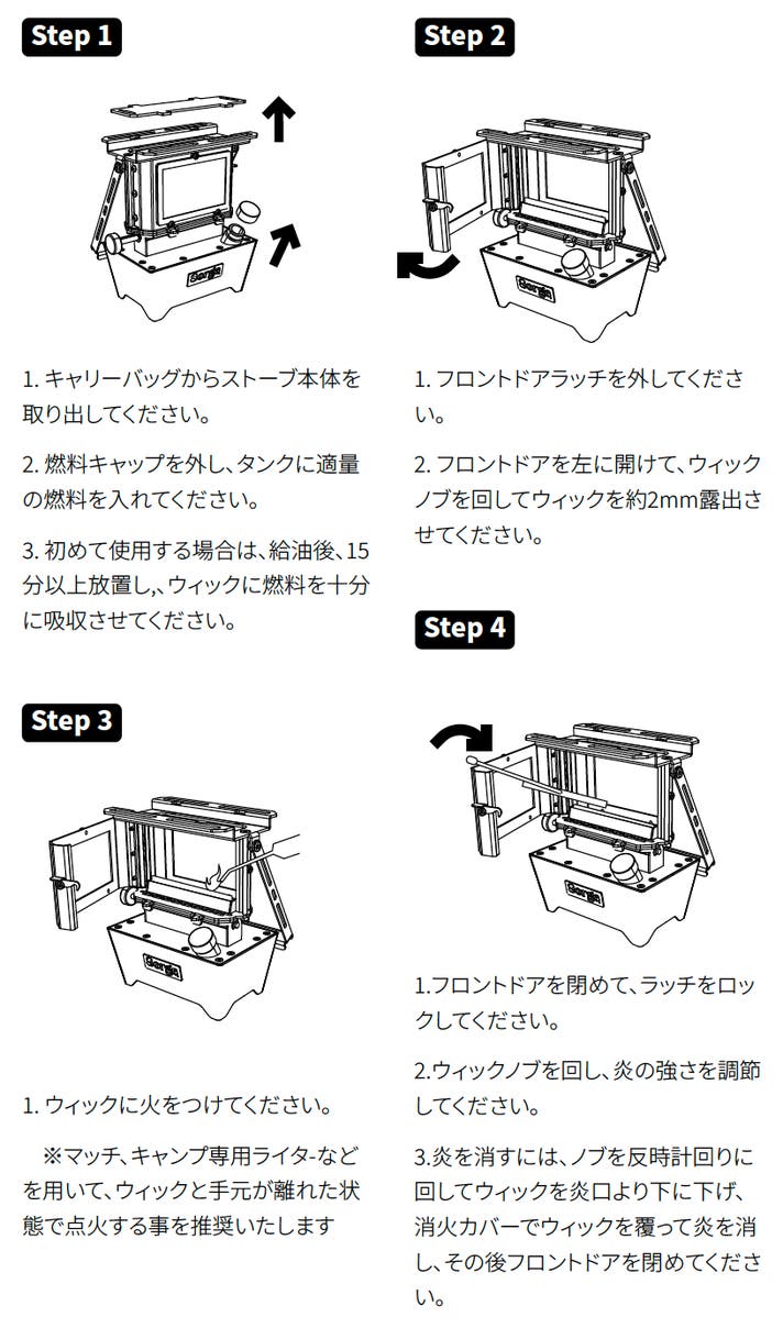 ※使用開始時、燃料が芯に完全にしみ込むまで5分ほどかかりますので、燃料がしみこんだことを確認してから点火してください。