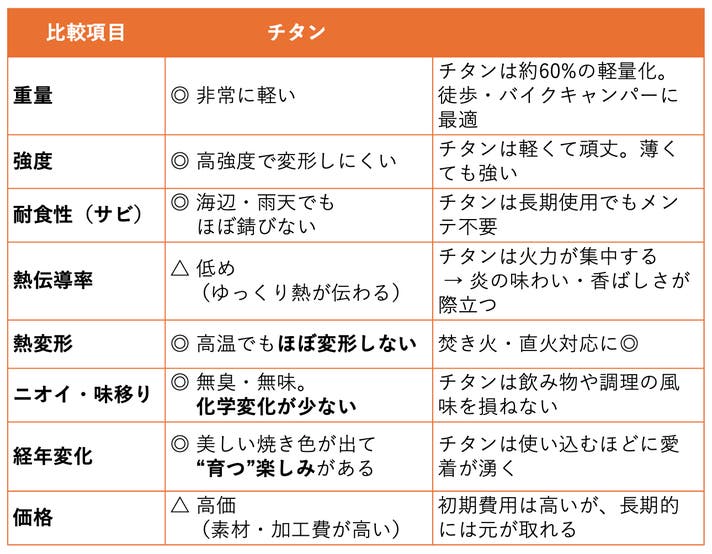 本体素材はオール純チタン製。強度はそのままに、ステンレスの約60%の軽さを実現。徒歩キャンパーやツーリングユーザーでも無理なく持ち運べます。