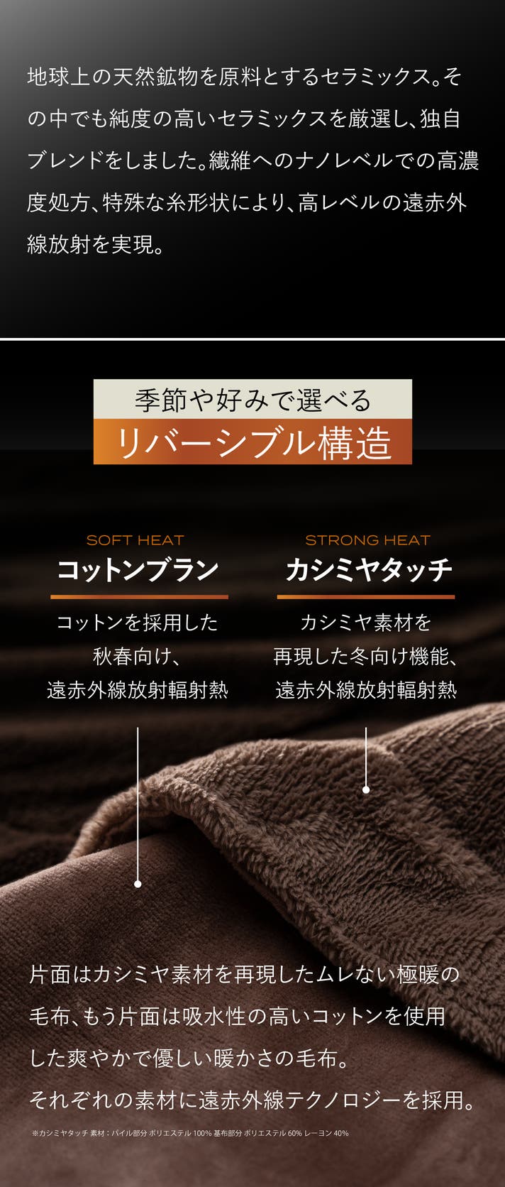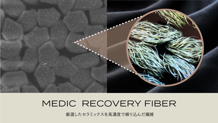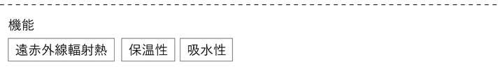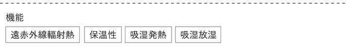 ナノレベルの厳選したセラミックスを数種類ブレンドしました。独自加工で、高濃度のセラミックスの練り込みに成功。さらに、特殊な糸形状により、高い輻射熱効果を実現しました。