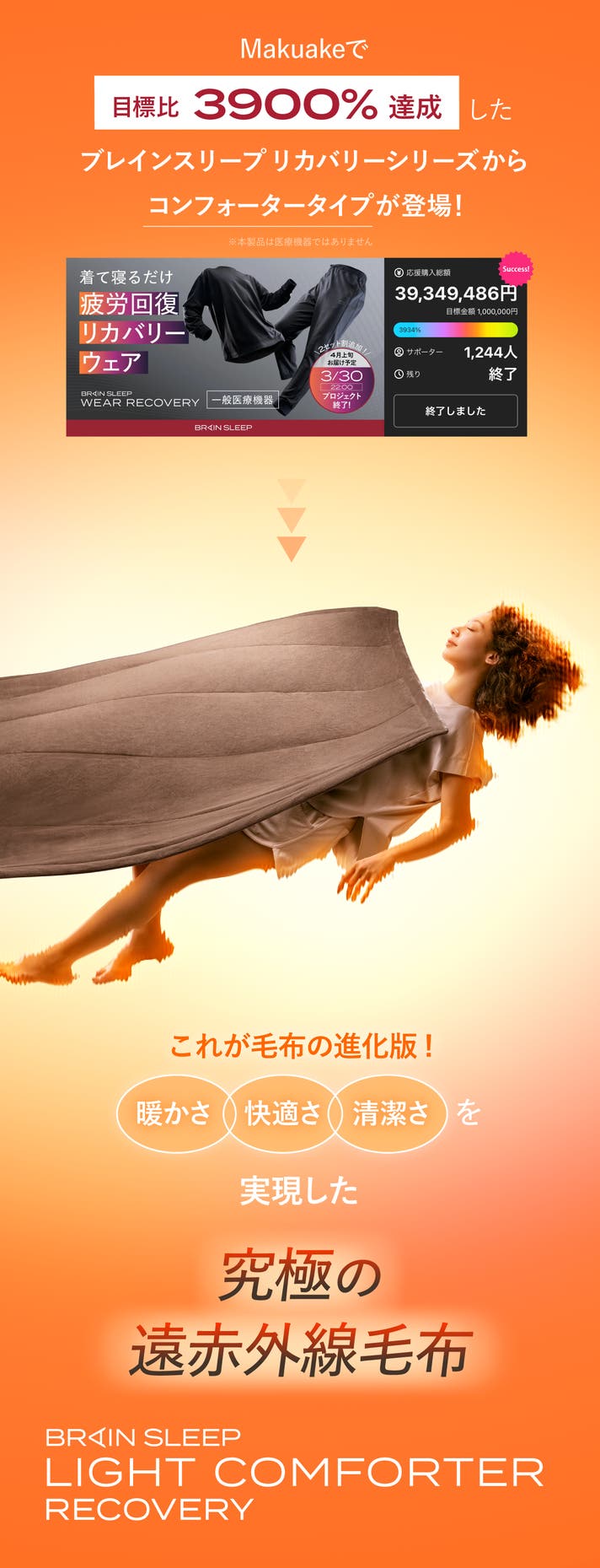 「Makuake(マクアケ)」は、実行者の想いを応援購入によって実現するアタラシイものやサービスのプラットフォームです。このページは、 プロダクトカテゴリの 「究極の温熱!遠赤外線テクノロジーで体を温めるリバーシブル毛布|ブレインスリープ」プロジェクト詳細ページです。