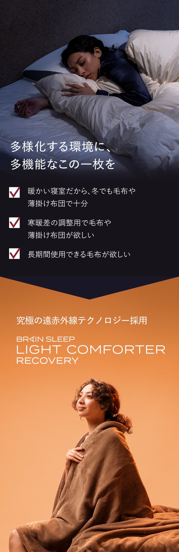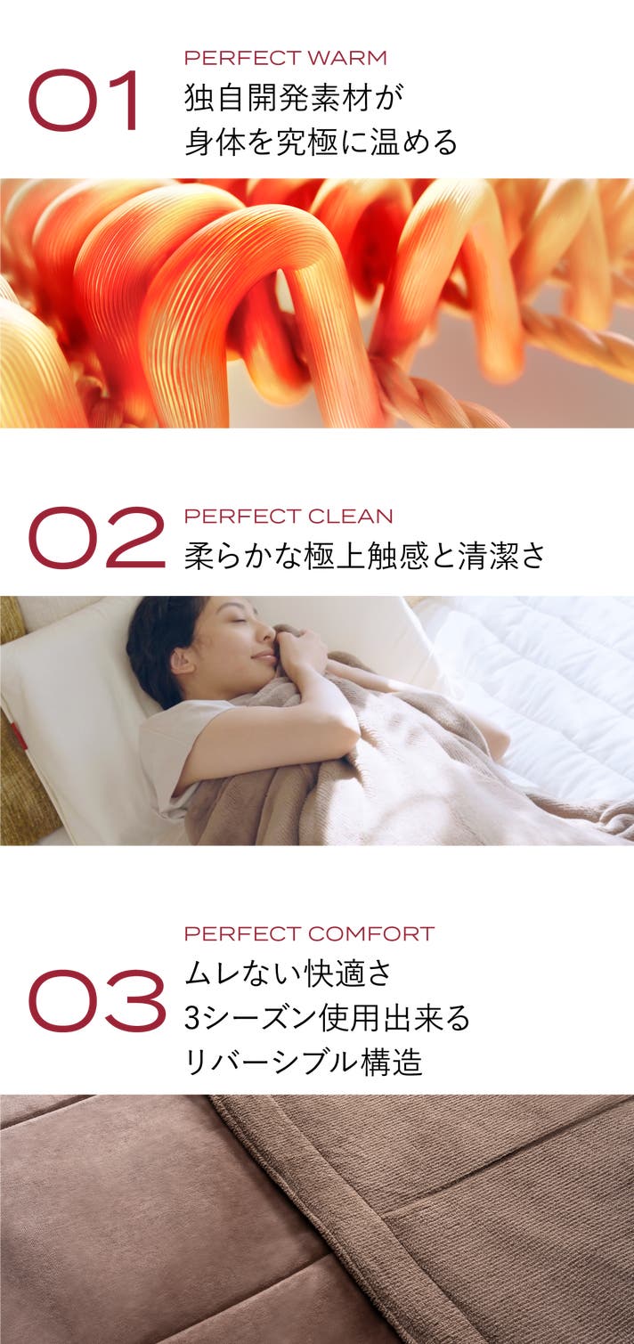 - 独自開発の遠赤外線テクノロジーで、寝ている間にムレずに身体を究極に温める進化版毛布