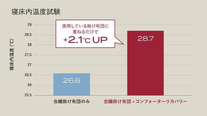 寒い冬の環境下で、使用している掛け布団の下に掛けるだけで2.1℃も温度上昇。使用している掛け布団の保温性をしっかりカバーします。
