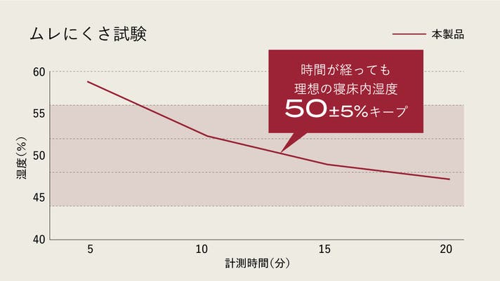 毛布全体で、湿気を吸って放湿するため、ムレない快適な寝床内湿度環境を実現。時間が経っても、理想の寝床内湿度50±5%をキープします。