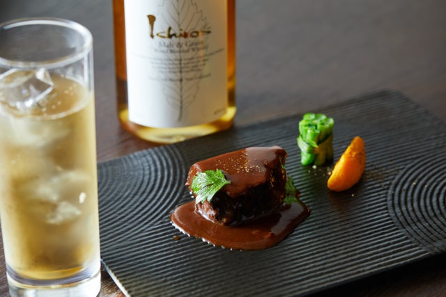 メインの「牛頰肉の赤ワイン煮込み」には、「イチローズモルト&グレーン ワールドブレンデッドウイスキー」のペアリング。