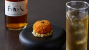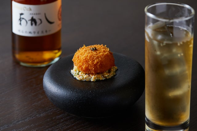 たとえば、「ズワイガニを使ったクリームコロッケ」には、「江井ノ島 ホワイトオーク あかし ハイボール」をペアリング。こちらはハイボールでご提供します。