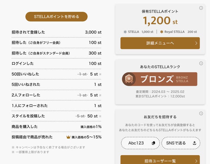 今回新たに追加された紹介機能では、アプリを紹介するだけでも報酬が得られます。被紹介者がアプリをダウンロード → 紹介者に【100〜300st】を付与被紹介者が商品を購入 → 紹介者に【購入額の3%】を報酬として還元
