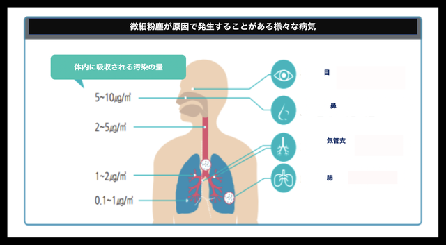 PM 2.5への暴露 は、心臓発作、不整脈、喘息の悪化、肺機能の低下、気道の刺激、咳、または呼吸困難などの呼吸器症状の増加、癌および心臓または肺疾患を持つ人々の早期死亡を引き起こすことが示されています。
