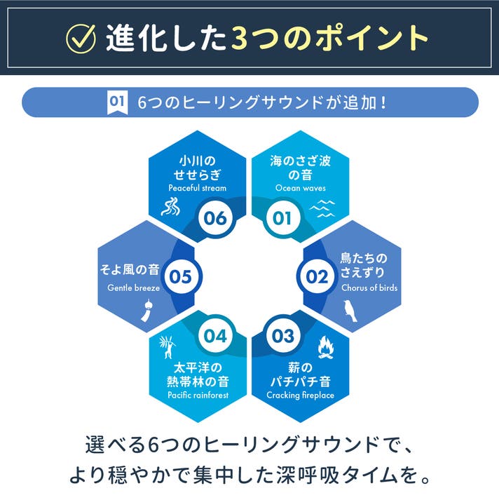 - 選べる6つの自然音で、より穏やかに自分と向き合う深呼吸タイムを。