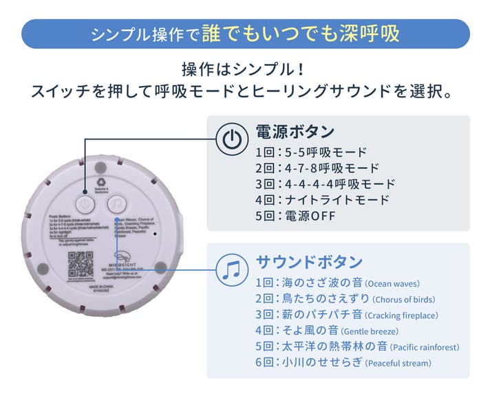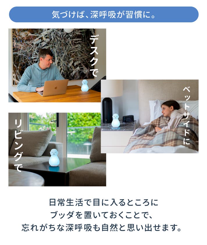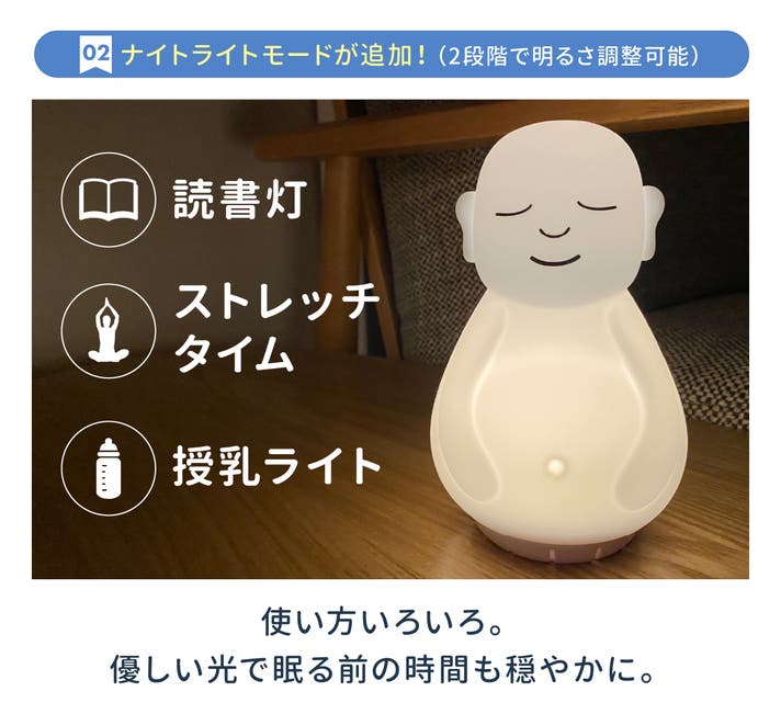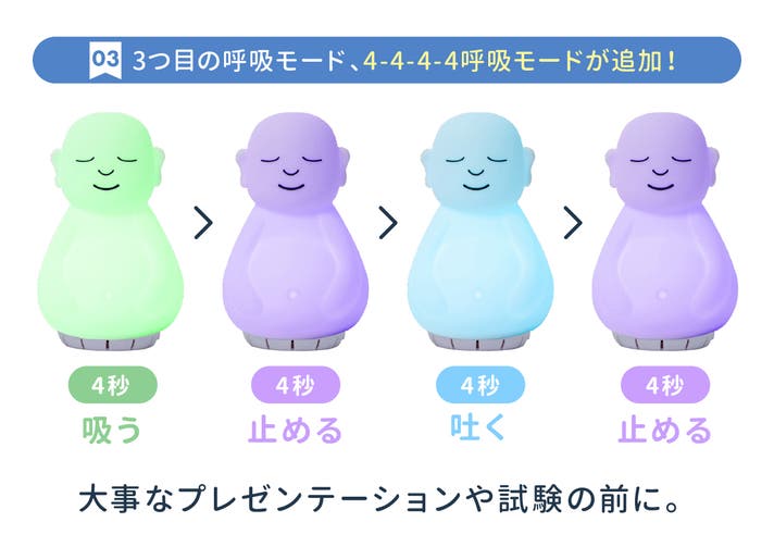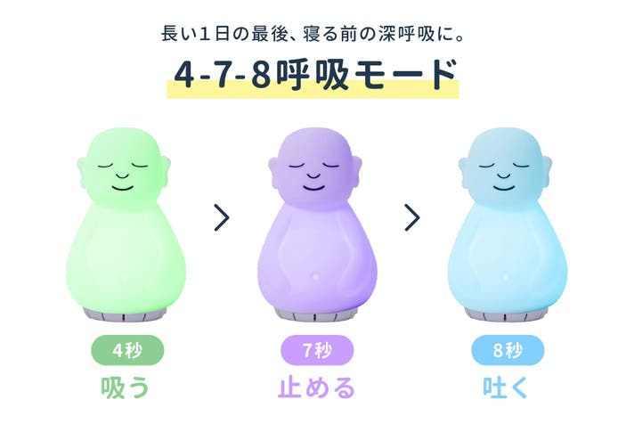 - 3つの深呼吸モードに加えて、寝る前の寝室にピッタリのナイトライトモードも搭載!