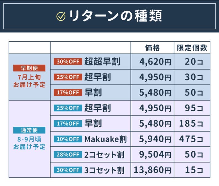 ※皆様の応援購入により量産効率が向上した場合、正規販売価格が販売予定価格より下がる可能性もございます。