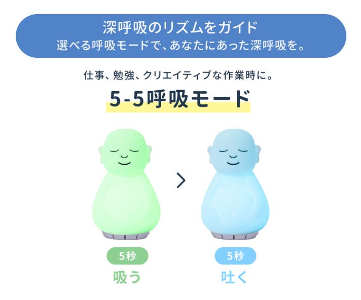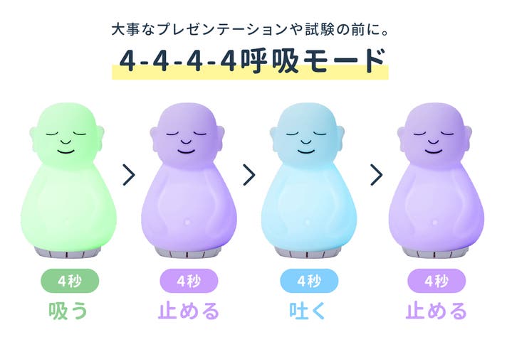 A. いいえ。あらかじめ用意されている3つの呼吸モードの秒数に合わせて、自動でブッダのカラーが変わっていきます。ご使用の際は、ブッダのカラーの変化に合わせて息を吸って、止めて、吐いてを繰り返していただく商品になります。