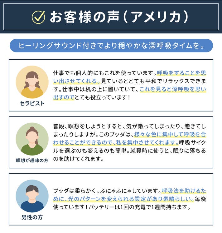 本製品『Breathing Buddha with sounds』は、呼吸に意識を向けるサポートツールであり、医療機器ではありません。特定の健康効果や医療的効果を保証するものではございません。あらかじめご了承ください。 製品の色味は、できる限り実物に近い状態で撮影しておりますが、ご使用のモニター環境や照明の違いにより、実際の色味と若干異なる場合がございます。 並行輸入品が発生する可能性があります。正規以外での個人輸入等は、完全に防ぐことができない場合がございます旨、予めご了承のほどお願いいたします。 並行輸入品は正規代理店による製品保証を受けることができません。 また、正規代理店を通じて購入することで、日本国内での流通に必要な各種認証の取得や、関税の適切な処理が担保されます。 本文中に記載させていただいたスケジュールは、あくまでプロジェクト公開時点の予定です。応援購入の性質上、配送遅延のおそれがございます。 原則として、配送遅延に伴う応援購入のキャンセルはできませんが、リターン配送予定月から3ヵ月を超えた場合には、希望者に限りキャンセルにて対応させていただきます。