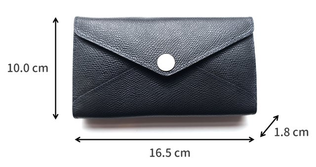 厚みは1.8cm(何も入れていない状態)に抑え、1万円が折らなくても収まるギリギリのサイズに仕上げました。