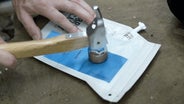 豆をハンマーで砕く工程、