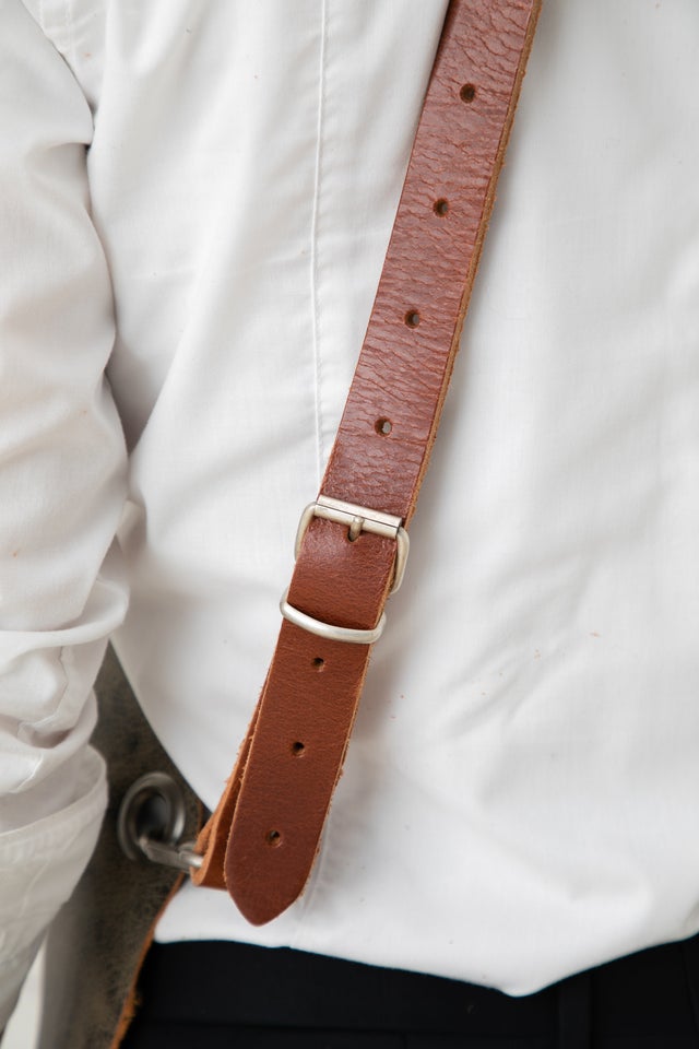 ストラップも頑丈で壊れにくいバファローレザーでできているので、ハードな作業中に本革エプロンが外れてしまうことはありません。脱着も簡単です。